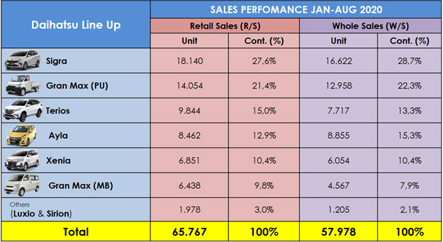 Secara akumulatif, hingga Agustus 2020, retail sales Daihatsu masih tetap didominasi oleh Astra Daihatsu Sigra dengan capaian sebesar 18.140 unit, berkontribusi sebesar 27,6%, lalu diikuti oleh Gran Max Pick-Up 14.054 unit (21,4%), dan Terios 9.844 unit (15,0%).